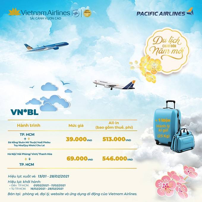 Bay liên danh Vietnam Airlines – Pacific Airlines cùng mức giá siêu tiết kiệm chỉ từ 39k/ chiều